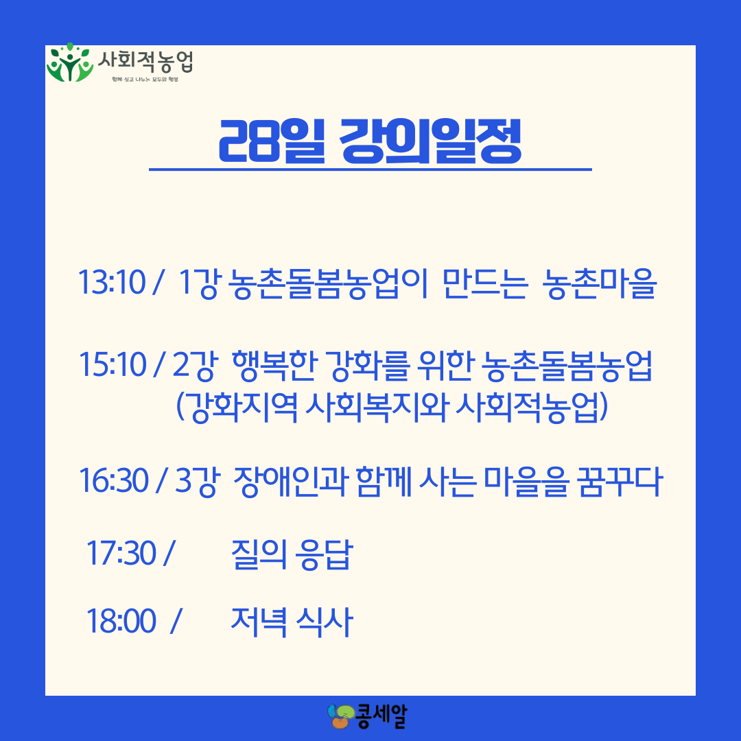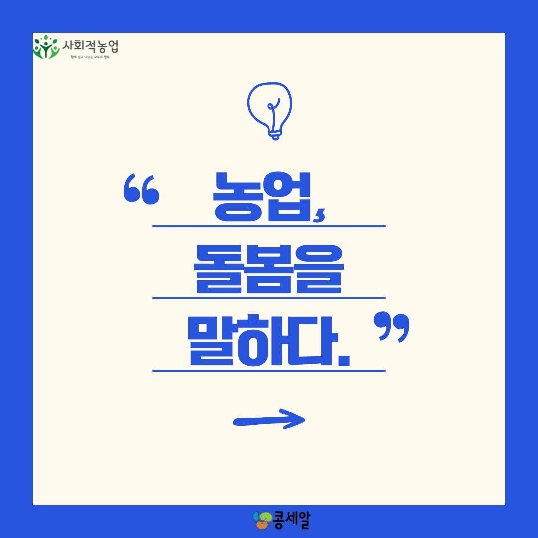 사회적농업 거점농장 (주) 콩세알에서 주관하는 농촌돌봄서비스 확대를 위한 시민 강좌가 청년공간 유유기지 강화에서 열립니다.