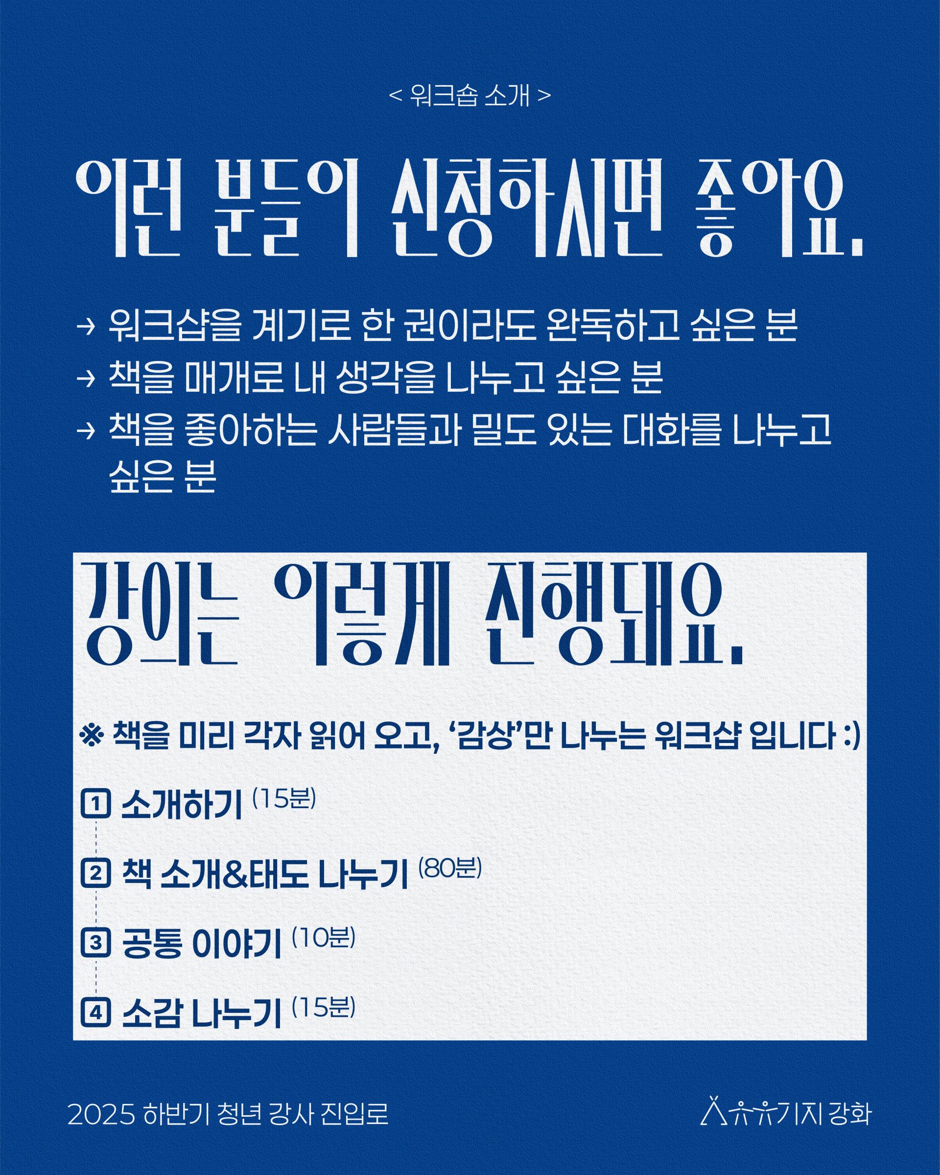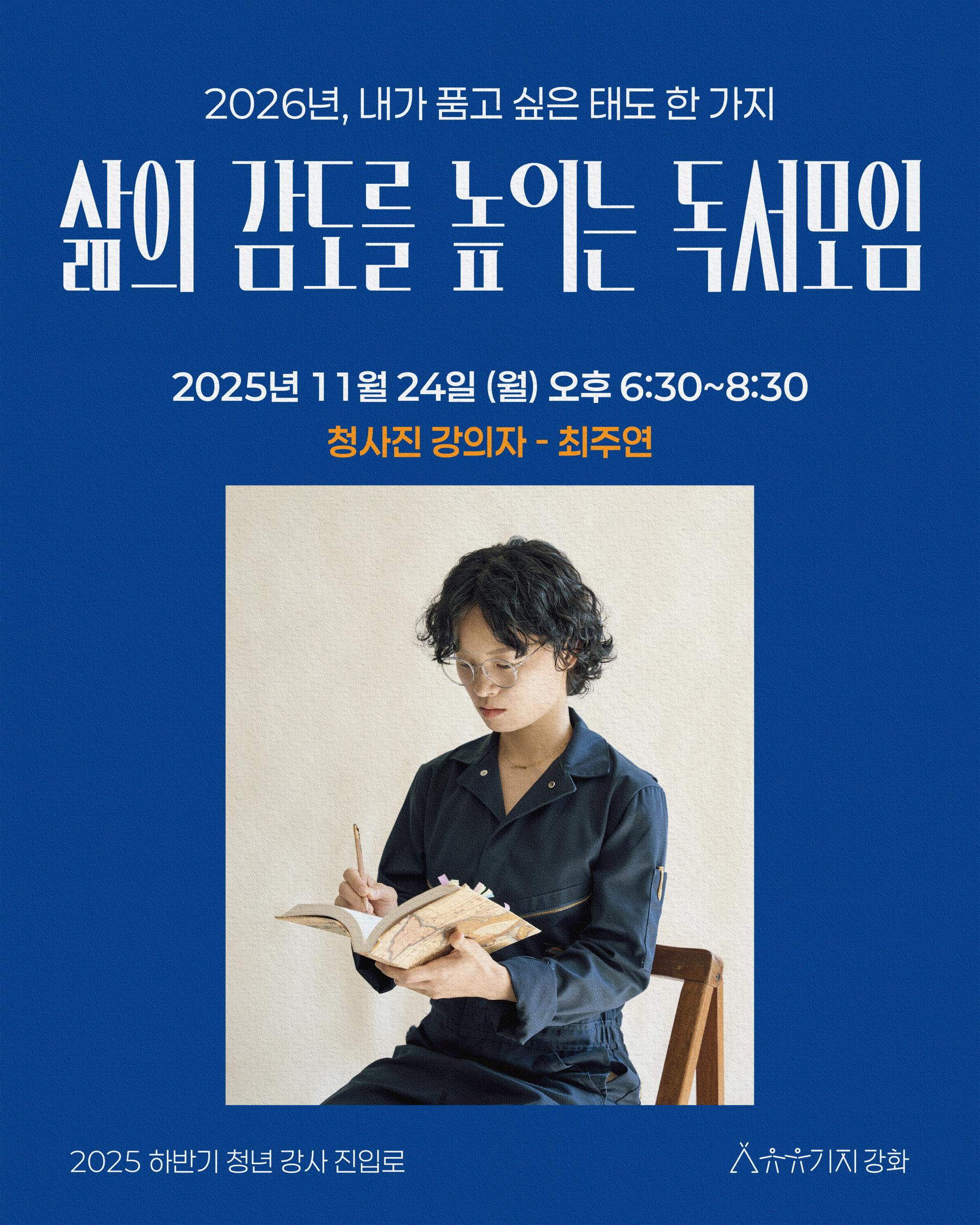 💡 청년 강사로서 시도를 응원하는 “2025 유유기지 강화 청사진” 사업의 일환으로, 7명의 강사가 강의를 진행합니다. 한 달간 강의 내용을 구체화하고 실행력을 높이는 과정을 가졌고 다양한 분야의 강의를 진행합니다.