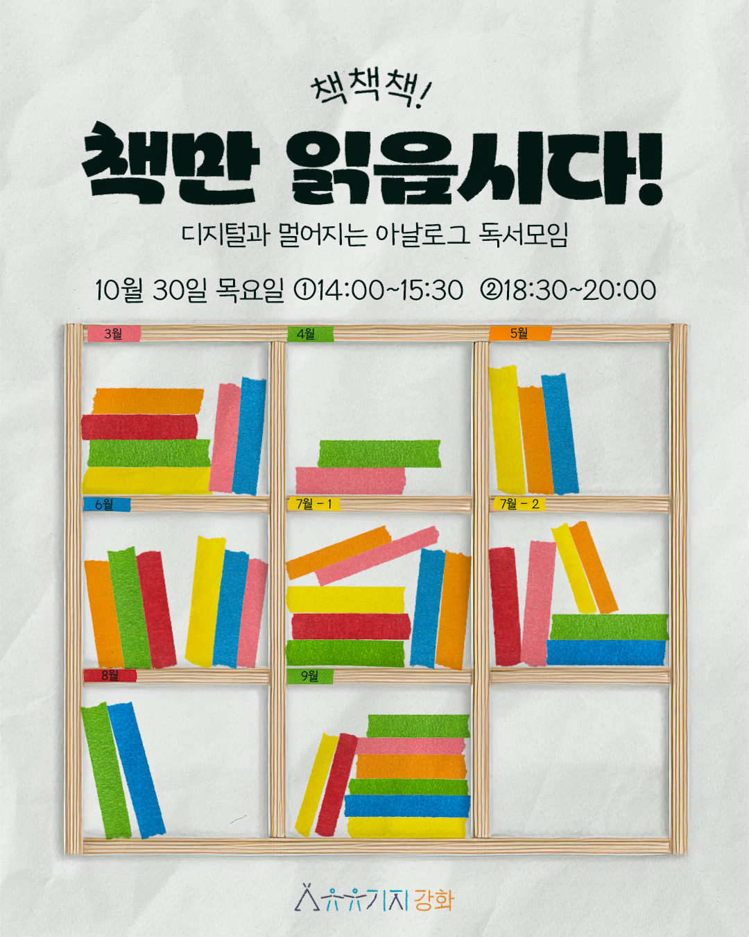 '책책책! 책만 읽읍시다!'는 자율 도서를 읽고 소감을 나누는 디지털 디톡스 독서 모임이에요.자유로운 참여를 위해 자율 도서로 운영되고 있어서여러분의 관심과 참여가 아주 중요한 모임이라는 사실!!9월에도 희망도서 신청을 받고있어요! 어떤 책을 신청하실지 아주 궁금합니다ㅎㅎ그럼 저는 여러분과 함께 책 읽을 날을 기다리고 있을게요.10월 30일, 유유기지 강화에서 만나요~