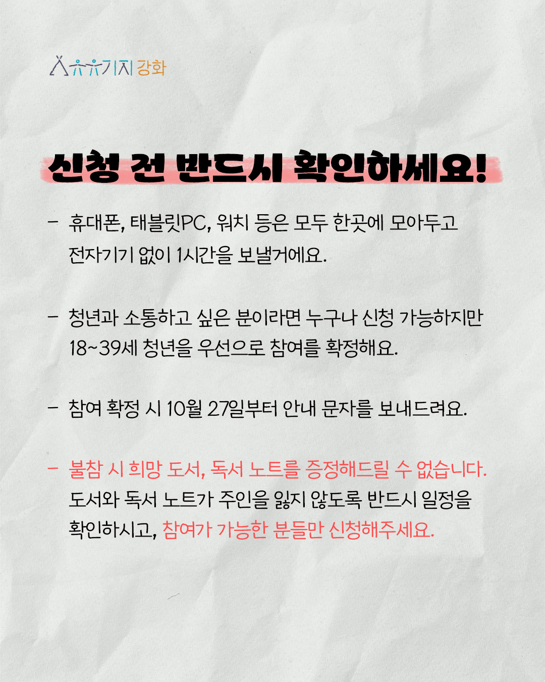 도서와 독서 노트가 주인을 잃지 않도록 반드시 일정을 확인하시고, 참여가 가능한 분들만 신청해주세요.