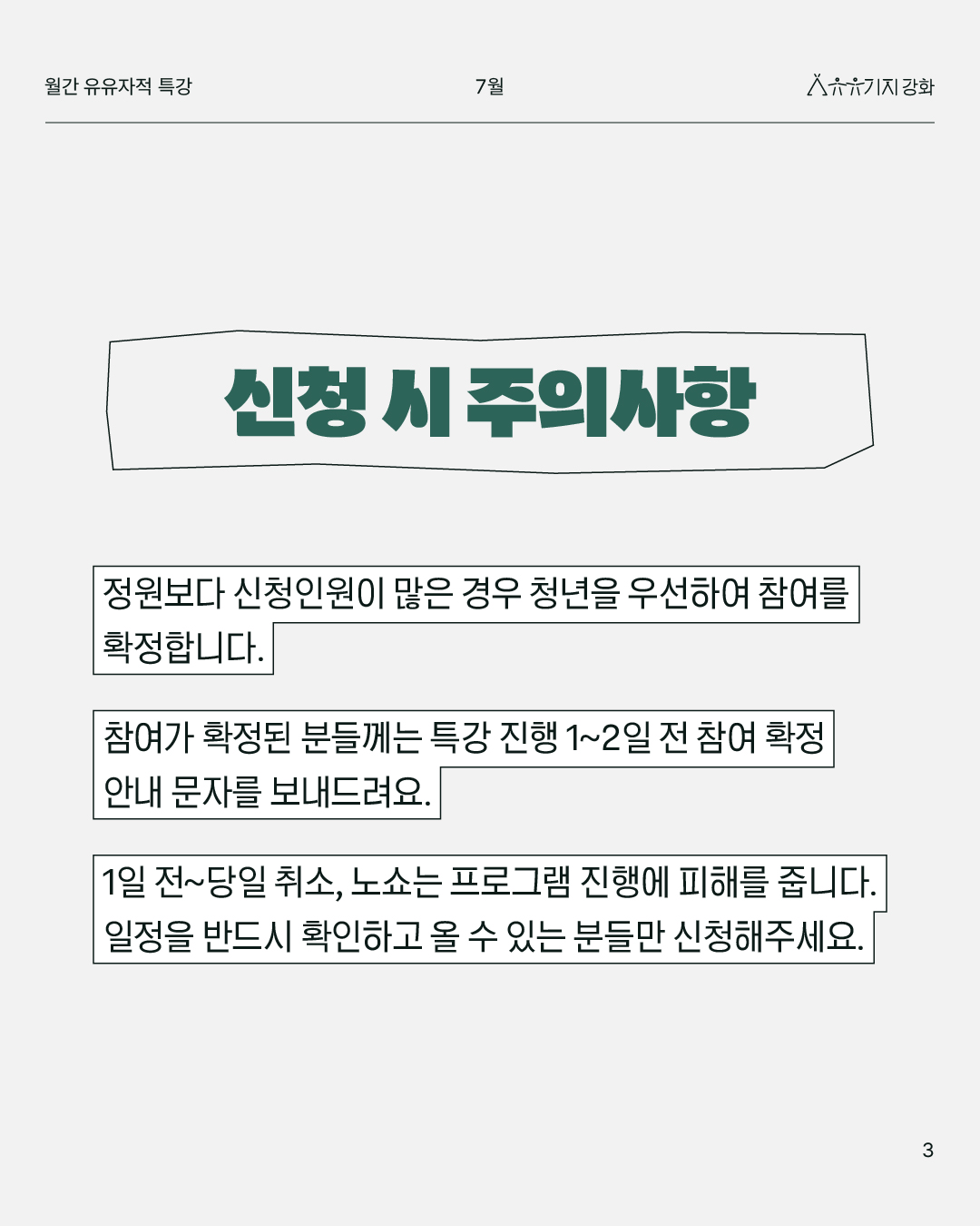 프로그램 신청 후 사전 연락 없이 노쇼 또는 당일 취소하시면 진행에 어려움이 생깁니다. 이런 경우 부득이 향후 프로그램 참여를 제한하고 있으니 사정이 생긴다면 반드시 센터로 미리 연락해주세요.